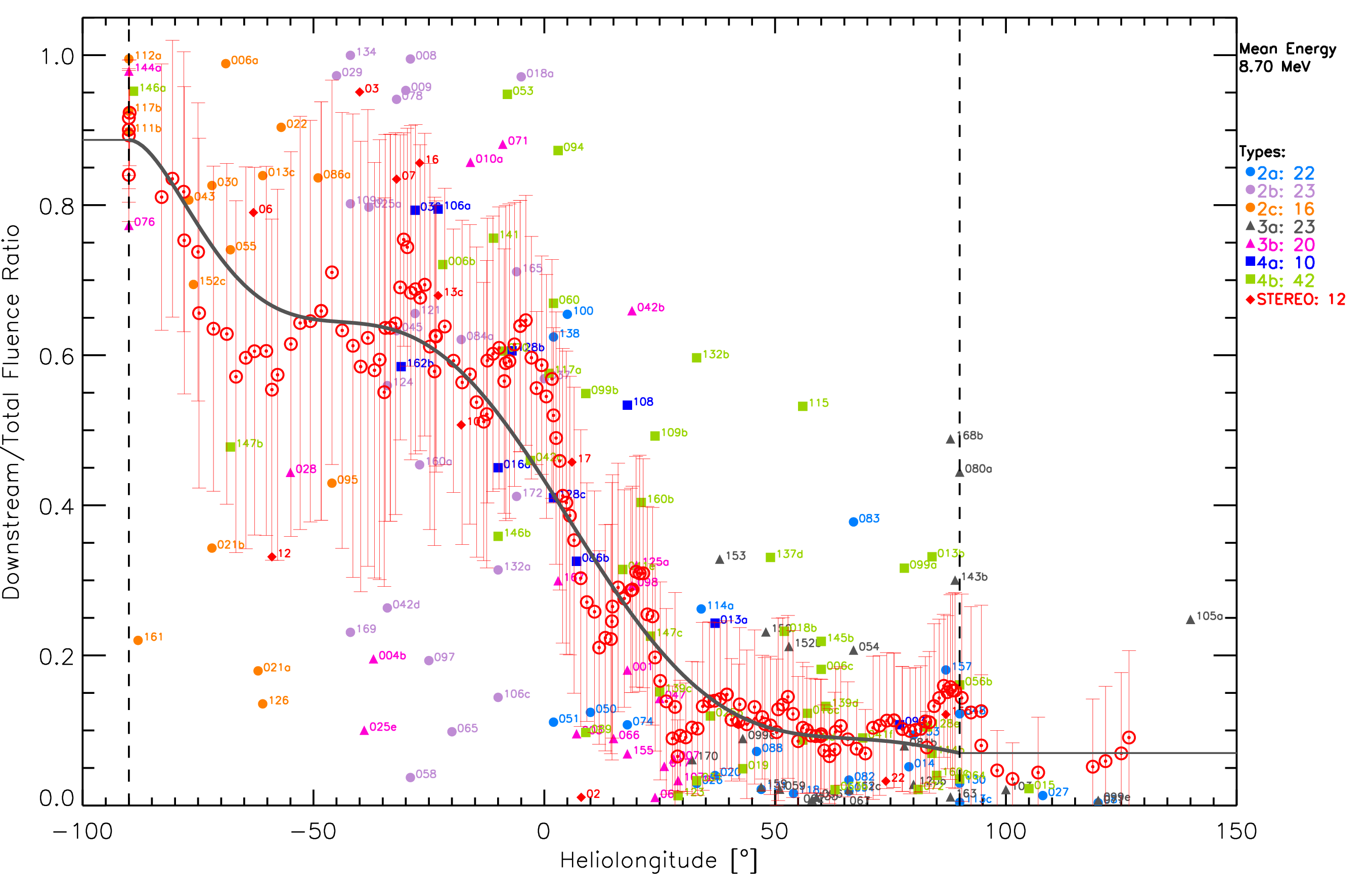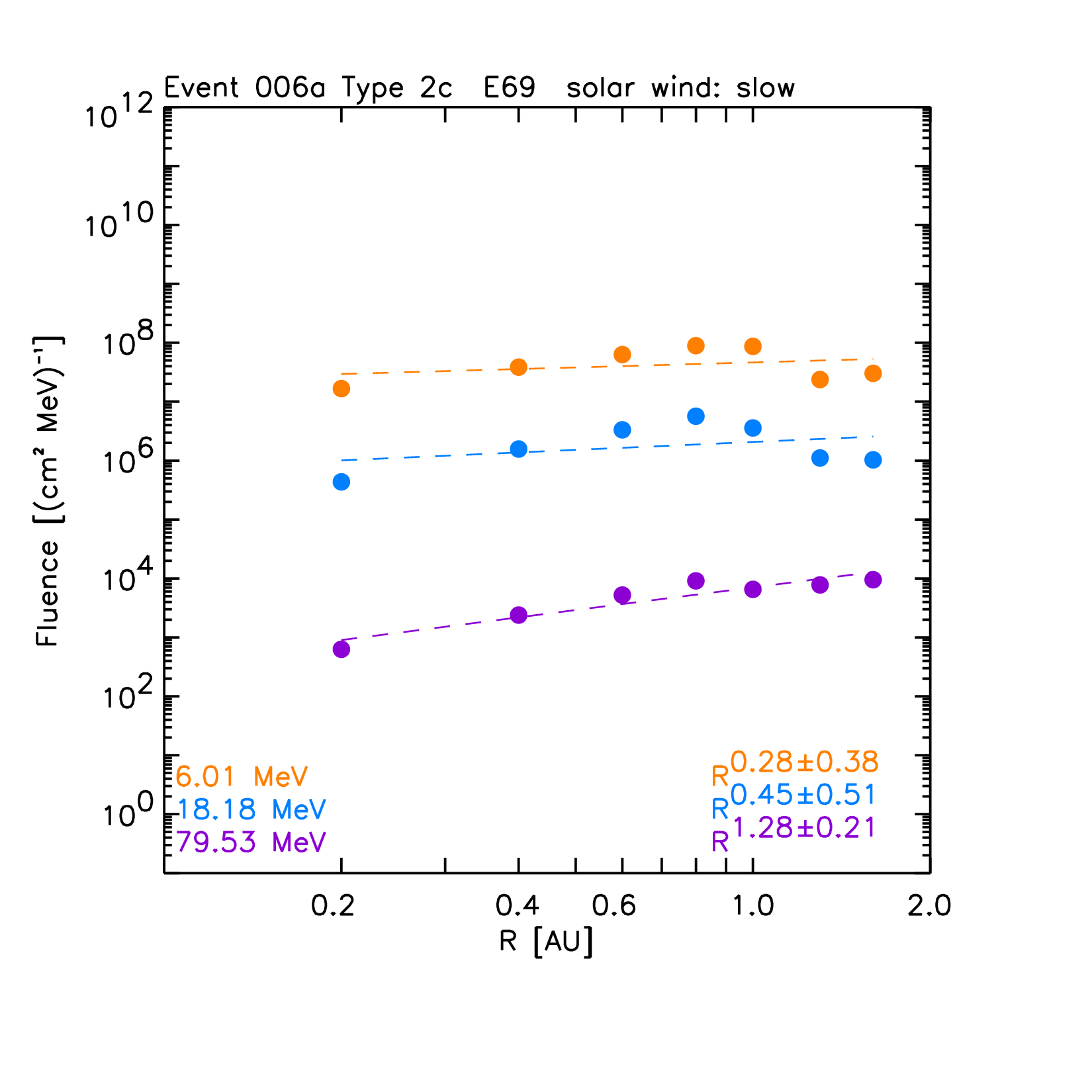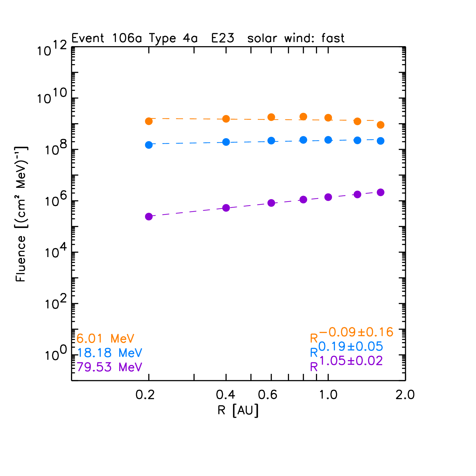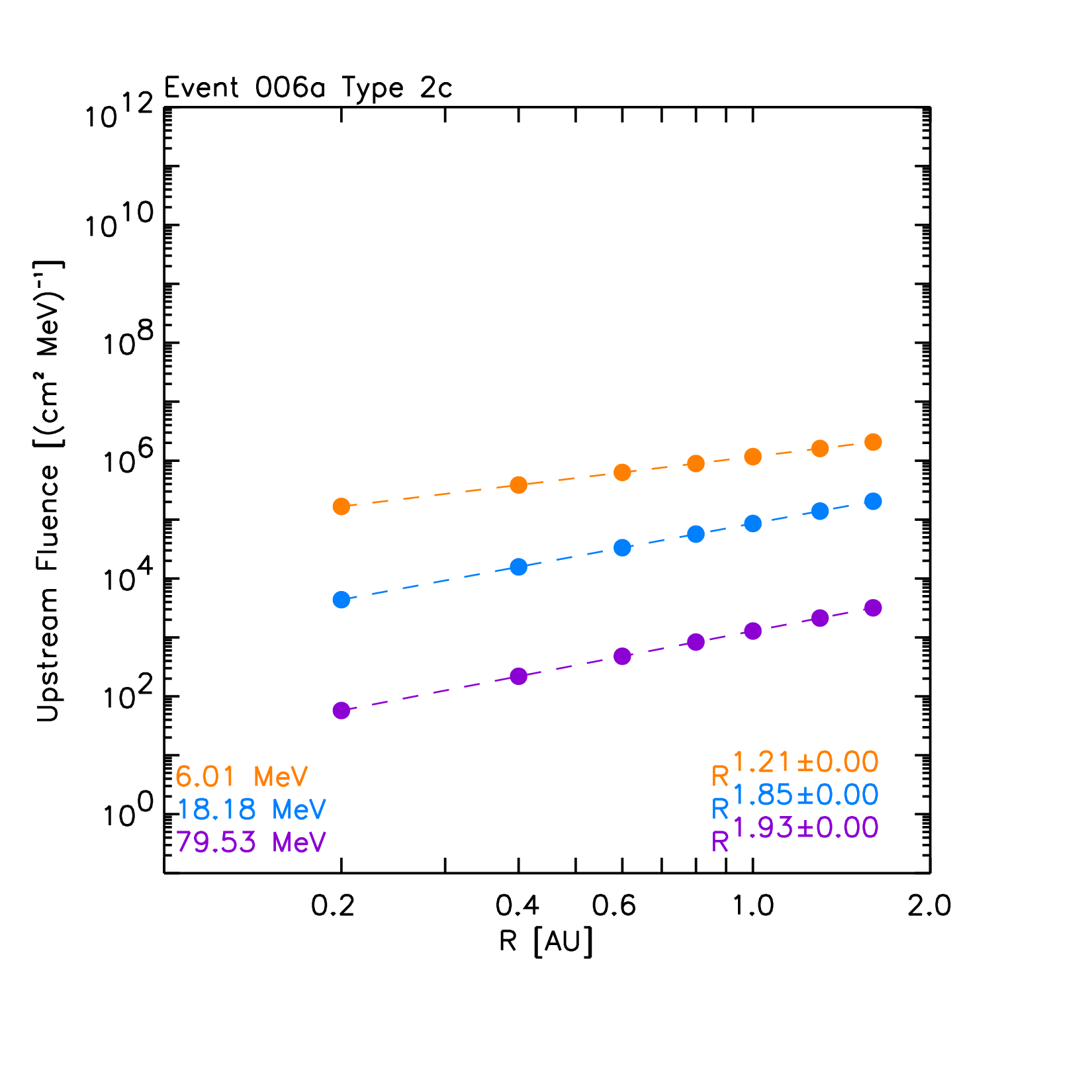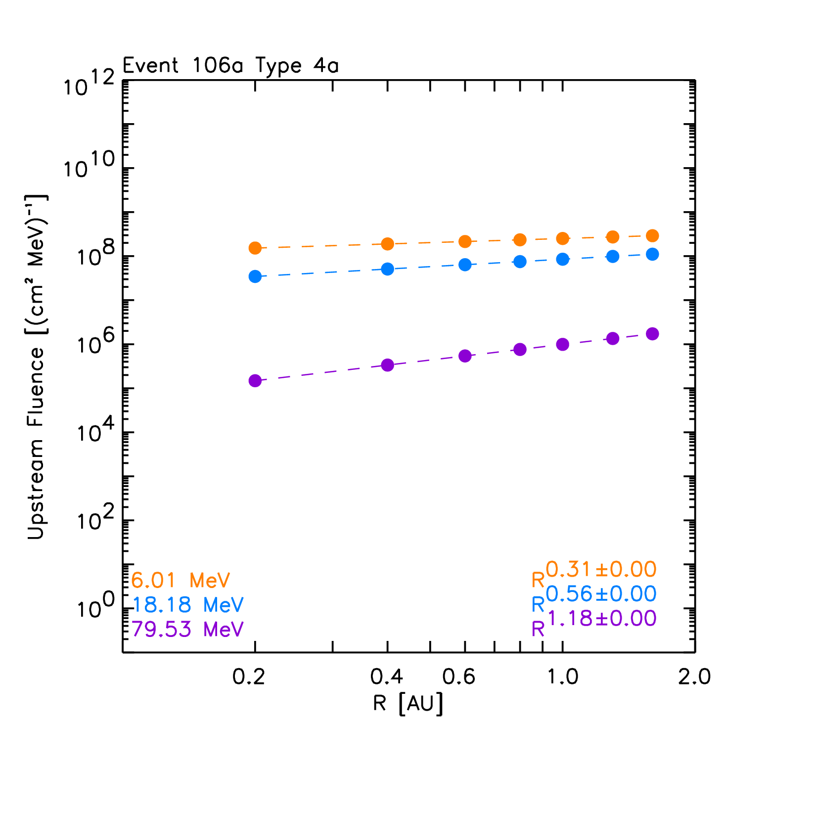 At this stage, for the calculation of the total fluence of the events (indicated by squares in the right panels of the graphs in Figure 8), we assume that the observed downstream-to-total fluence ratios (DTFRs) keep constant with the radial distance. The final adopted values for the DTFRs are described below.