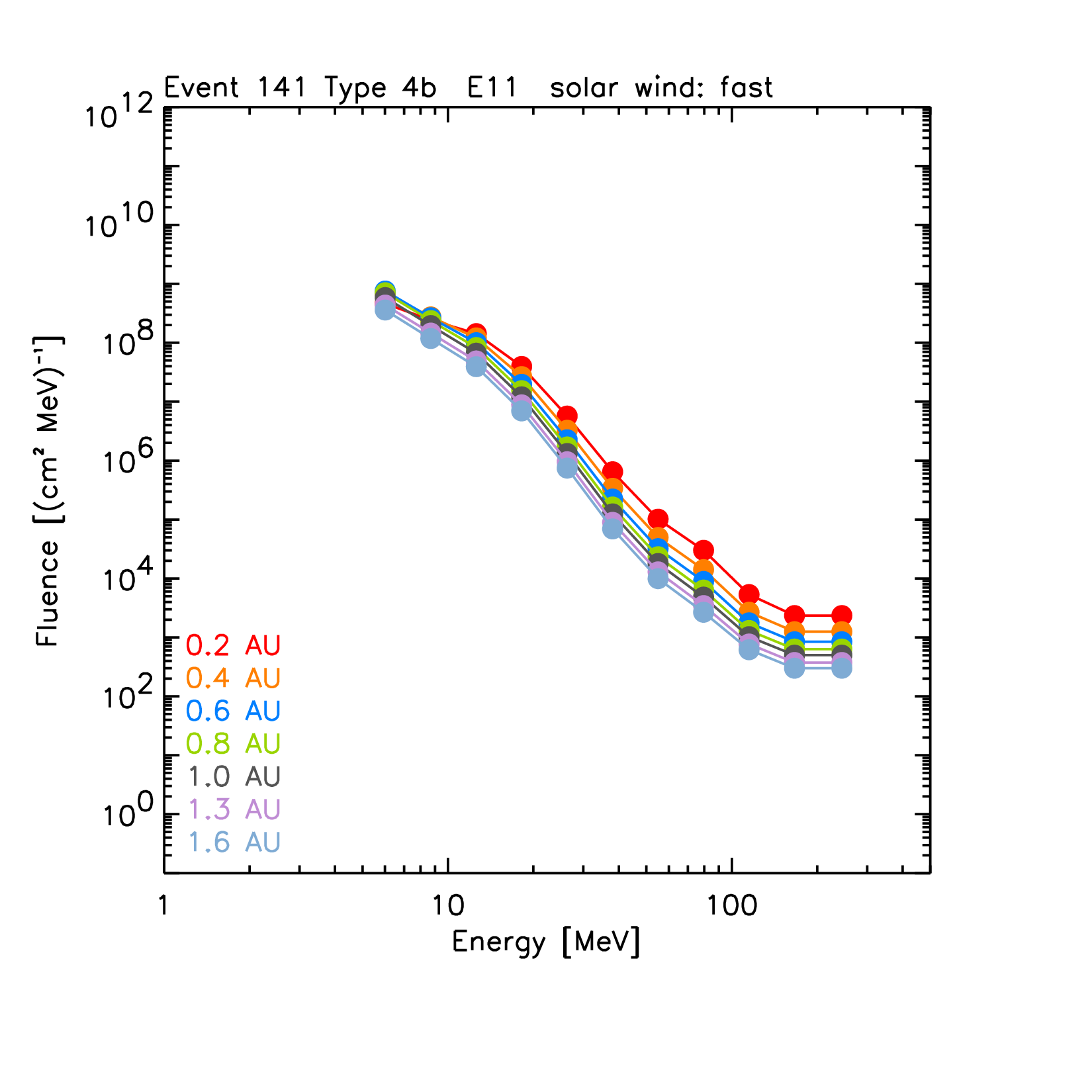 In such compound events, the peak intensity of each proton enhancement has been scaled to other radial distances according to its sub-type and the selected value is the highest among the SEP enhancements for each energy and radial distance. To compute the fluences of the compound events, first the fluence of each individual SEP event (or each SEP enhancement) is scaled according to the power law of its sub-type. Next, the scaled fluences are added to account for the fluence of the compound event. Figure 14 shows the example of the Halloween events in October—November 2003. This compound event is formed by 5 SEP events, two of them classified as Type 4a-p and the other three as Type 4b. As in the previous figure, Figure 14 shows the peak intensity (left) and total fluence (right) energy spectra across the simulated radial distances (colour coded) for the Halloween events. For both magnitudes and for all energies, the largest values are predicted for the virtual observer placed at the closest distance from the Sun.