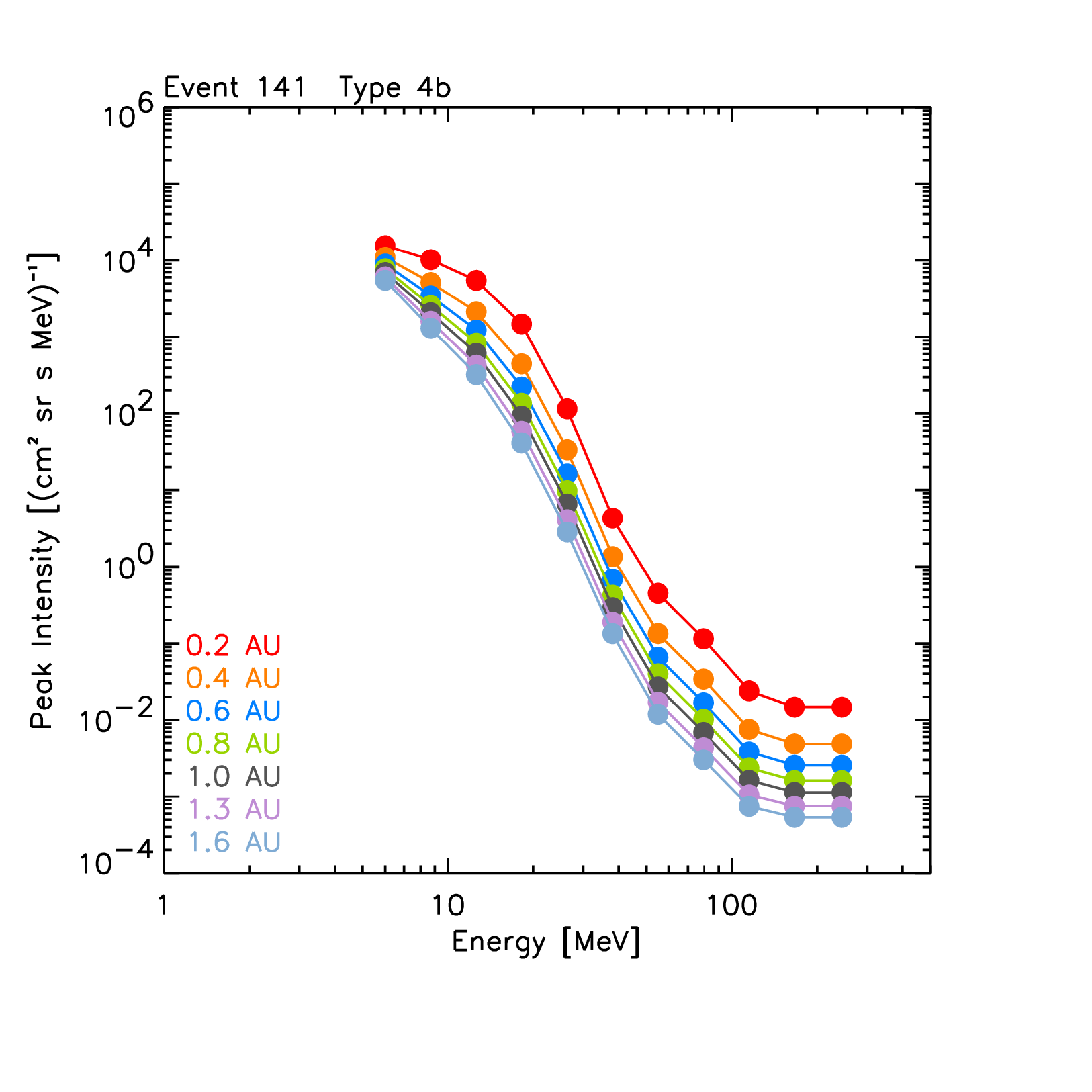 Once the SEP events in REL are classified into one of the ten sub-types, the peak intensity and fluence spectra across radial distances can be computed. Figure 13 shows an example of the resulting spectra for the individual SEP event on 13 May 2005. After revision of the data set, this event was classified as a Type 4b event. The left panel of Figure 13 shows the peak intensity energy spectra across the simulated radial distances (colour coded) whereas the right panel shows the corresponding plot for the total fluence. The largest values are obtained for the virtual observer located at 0.2 AU, with the exception of the fluence for the two lower energies. In these latter cases, the predicted heliocentric radial dependence of the fluence is almost flat, resulting from the radial dependence derived by SOLPENCO2 for the 2006 December 13 SEP event (the reference event for Type 4b) for these two energies.