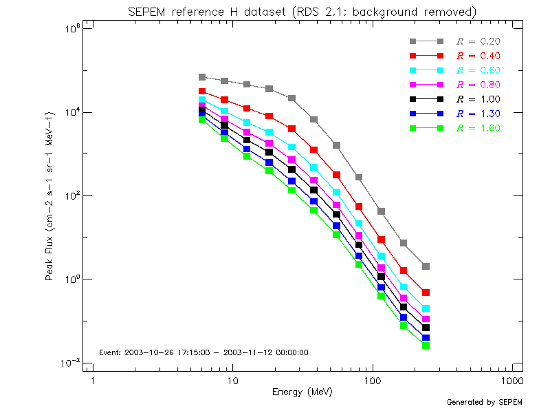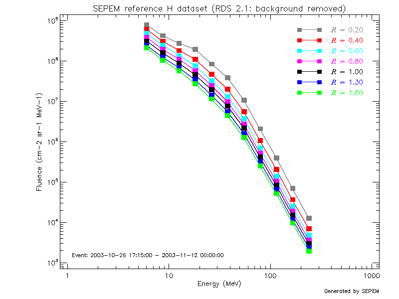Figure 14. Intensity spectra for the Halloween events (26 October—12 November 2003) using SEPEM RDS v2.1