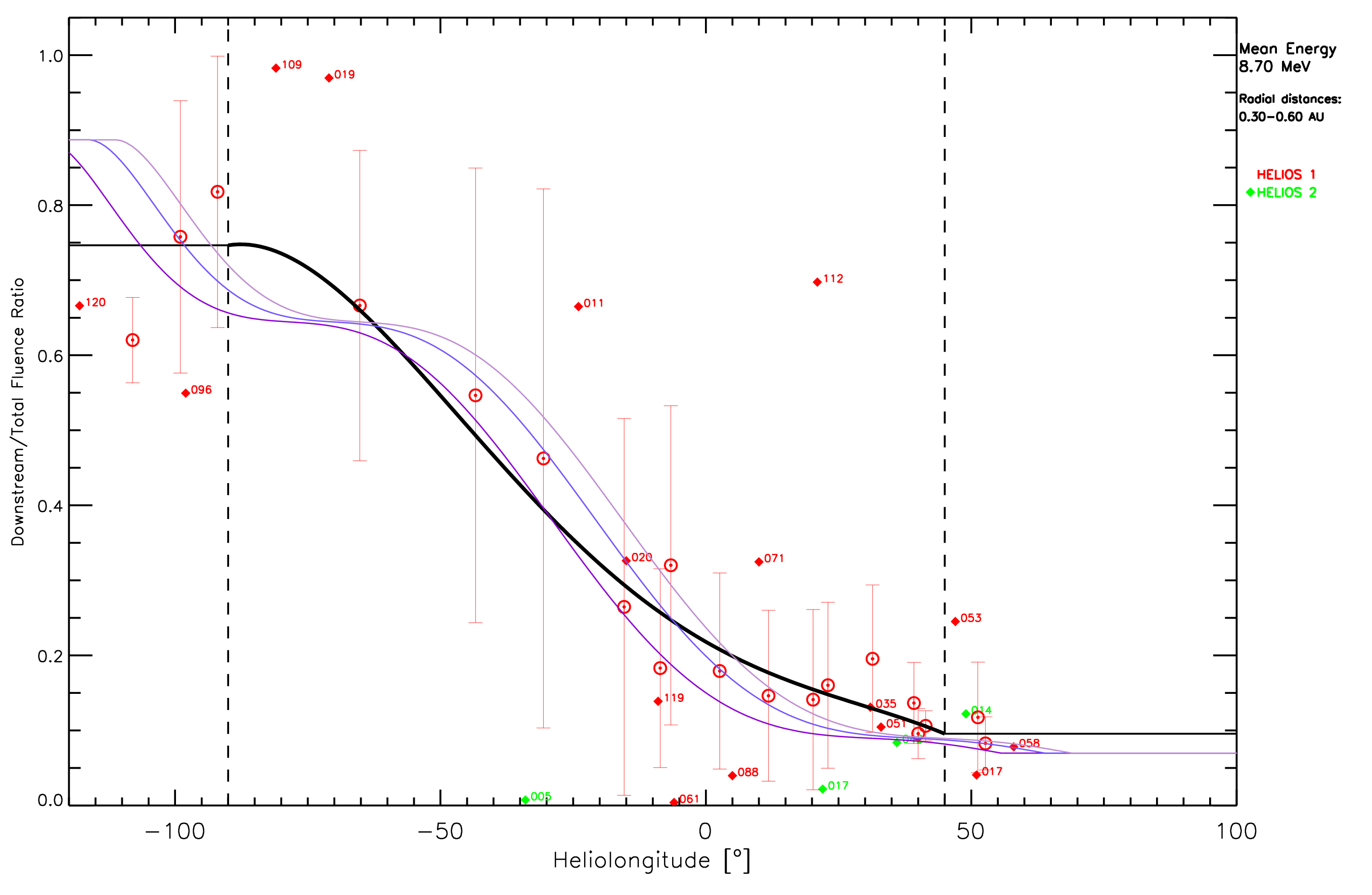 Once it was established that there exists a variation of DTFRs with the heliolongitude in SEP events, we extended the study of the DTFR variation with the heliolongitude to: In summary, from the evaluation of the DTFRs we obtain: In order to characterise the DTFRs at other radial distances, we will use the polynomials derived from data at 1 AU, and assume that the longitudinal dependence of the DTFRs is more important than the radial dependence: The right panel of Figure 11 illustrates, for the 8.7 MeV reference energy, the translation of the 1 AU tendencies to the other radial distances. The mauve, violet and purple lines in the right panel of Figure 11 show the grey 1 AU polynomial fit shown in the left panel of this figure, translated to a heliocentric radial distance of r = 0.45 AU, for the three solar wind options. Tendency lines derived for the fast solar wind are the curves with the smallest displacement in longitude (mauve curves) and those for the slow solar wind are the lines showing the largest displacement (purple curve). Tendency lines for the intermediate solar wind lie between the other two (violet curves). The 1 AU derived curves fit closely those derived from the Helios data and, overall, they reside within the standard deviations found for the moving means, apart from one or two points. The same is true for the remaining energy channels, with comparisons at higher energies giving improved results.