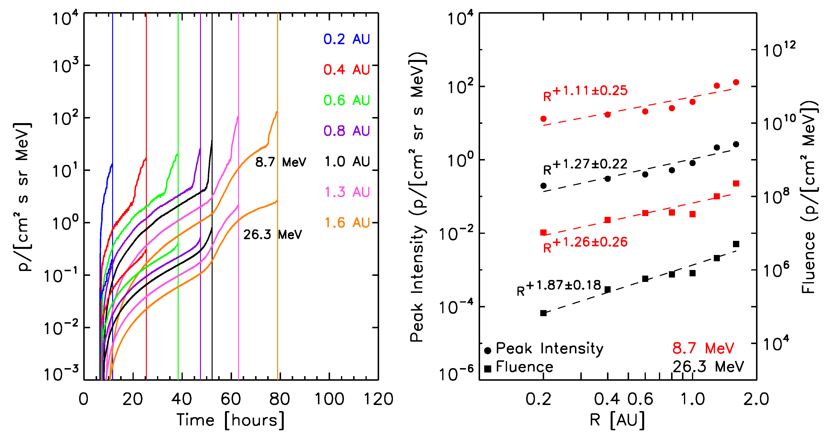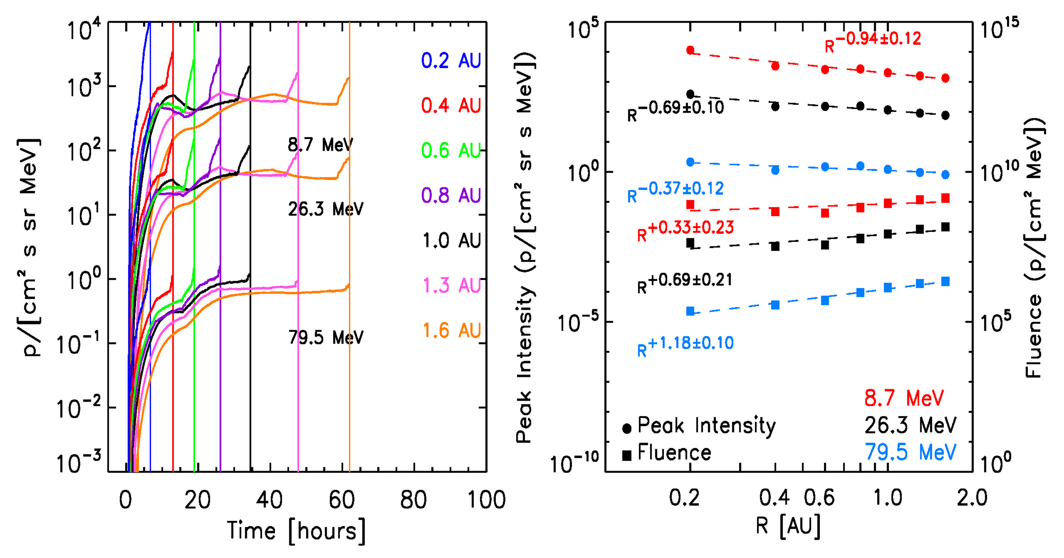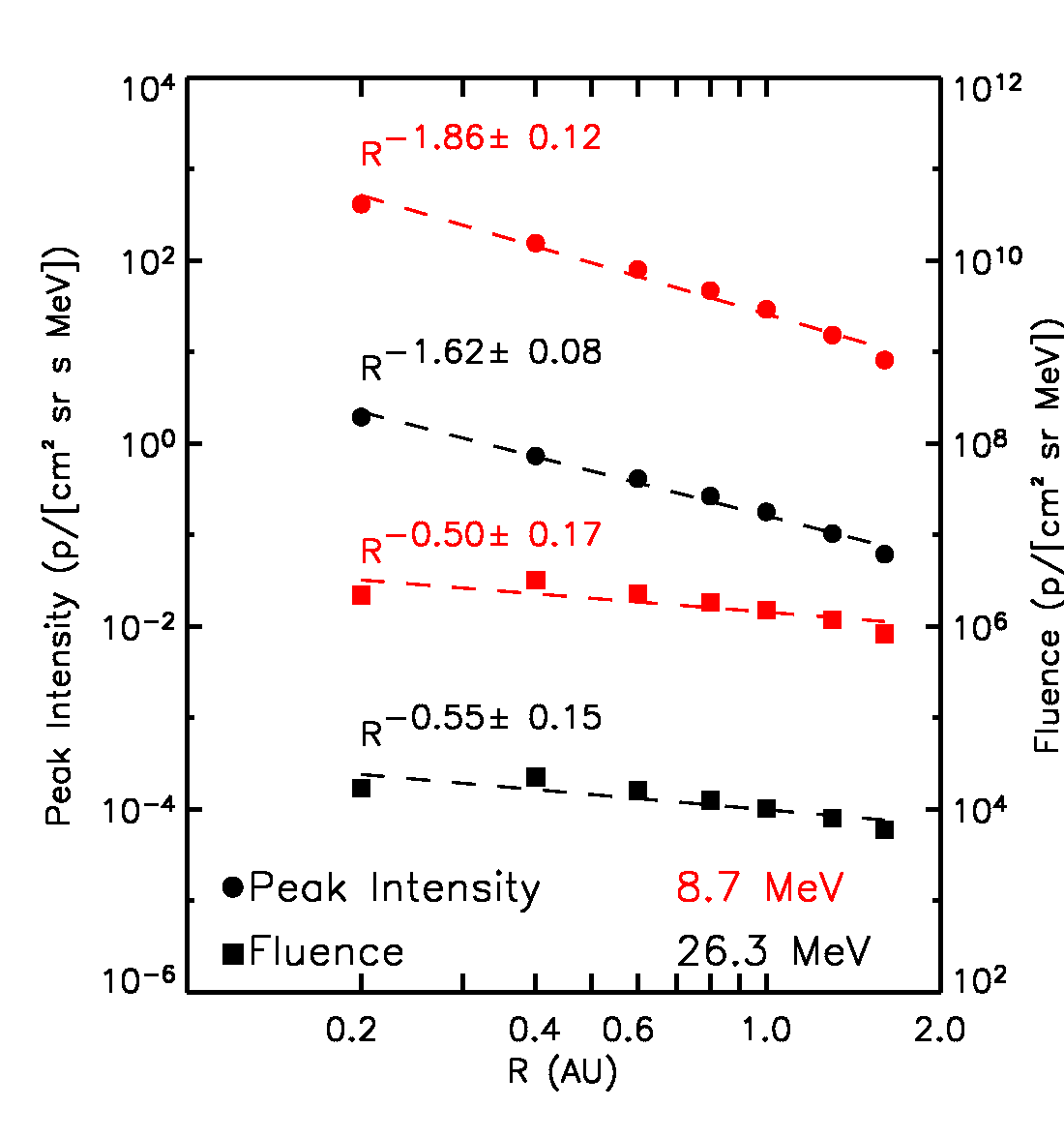As can be seen in Figure 4 and Figure 8 (below), the derived peak flux and fluence dependences with radial distance are different event to event and depending on the proton energy considered. The radial power-law indices derived differ from the inverse quadratic/cubic law frequently assumed and close to those derived observationally for similar scenarios [20].