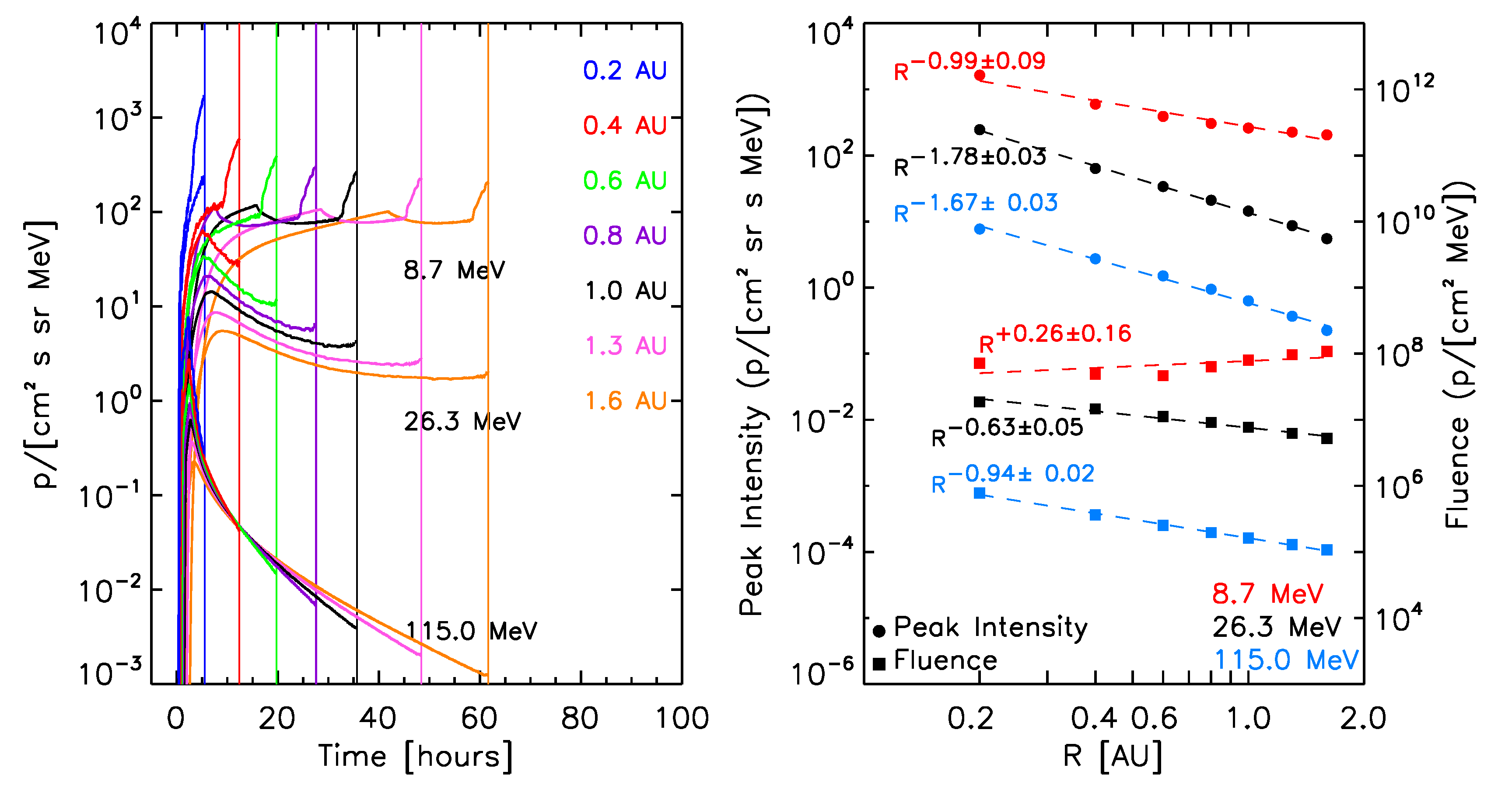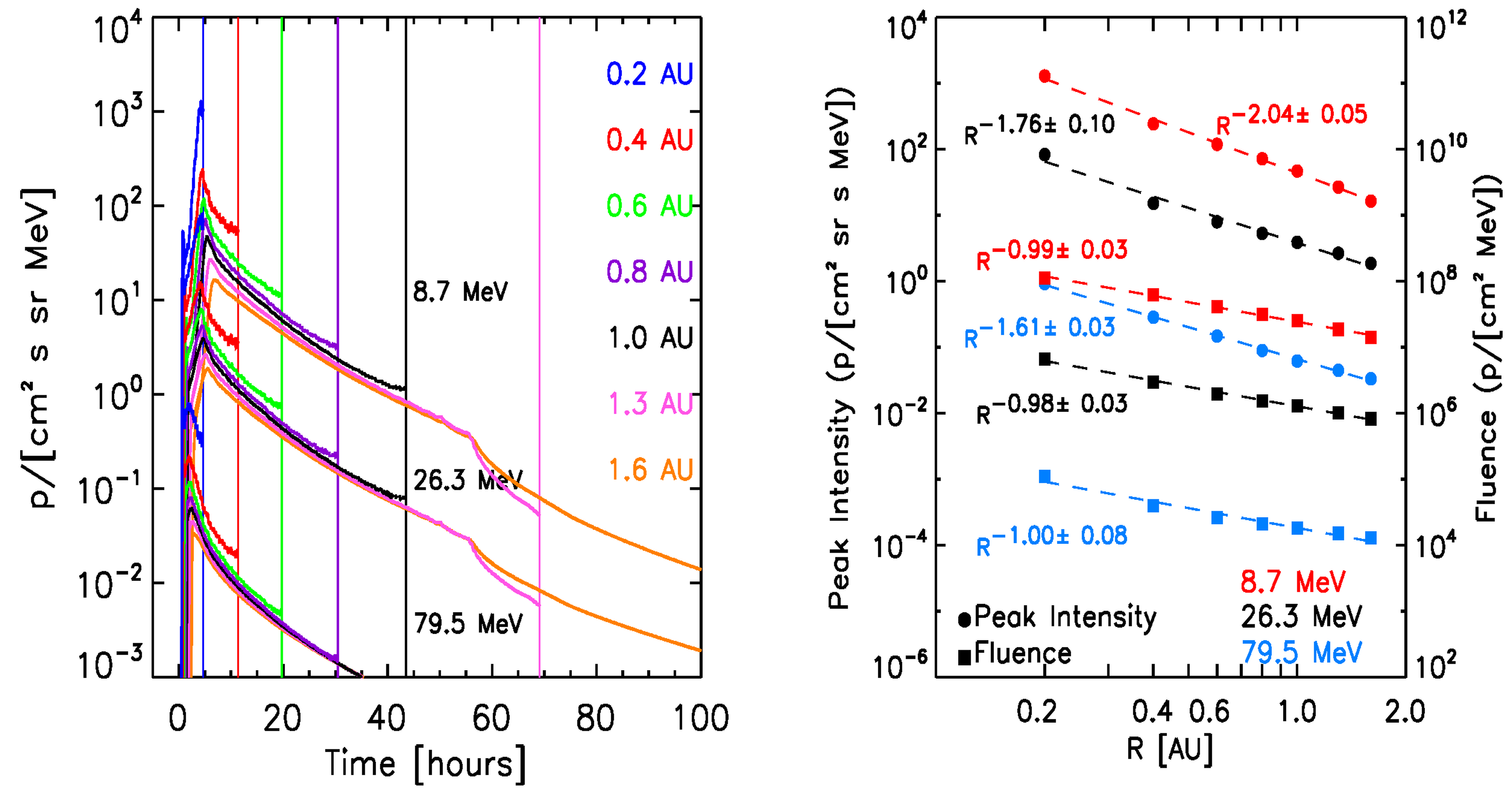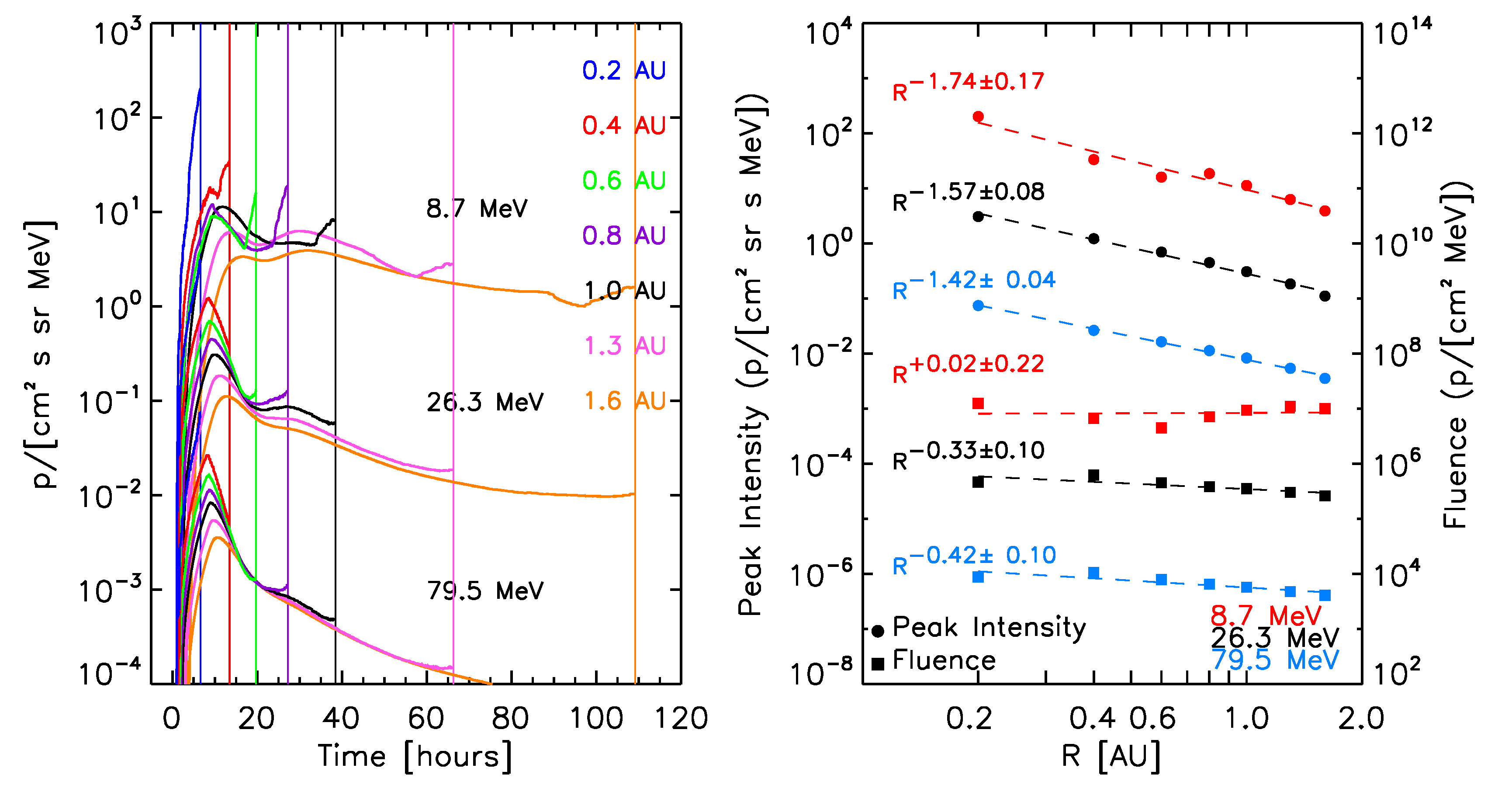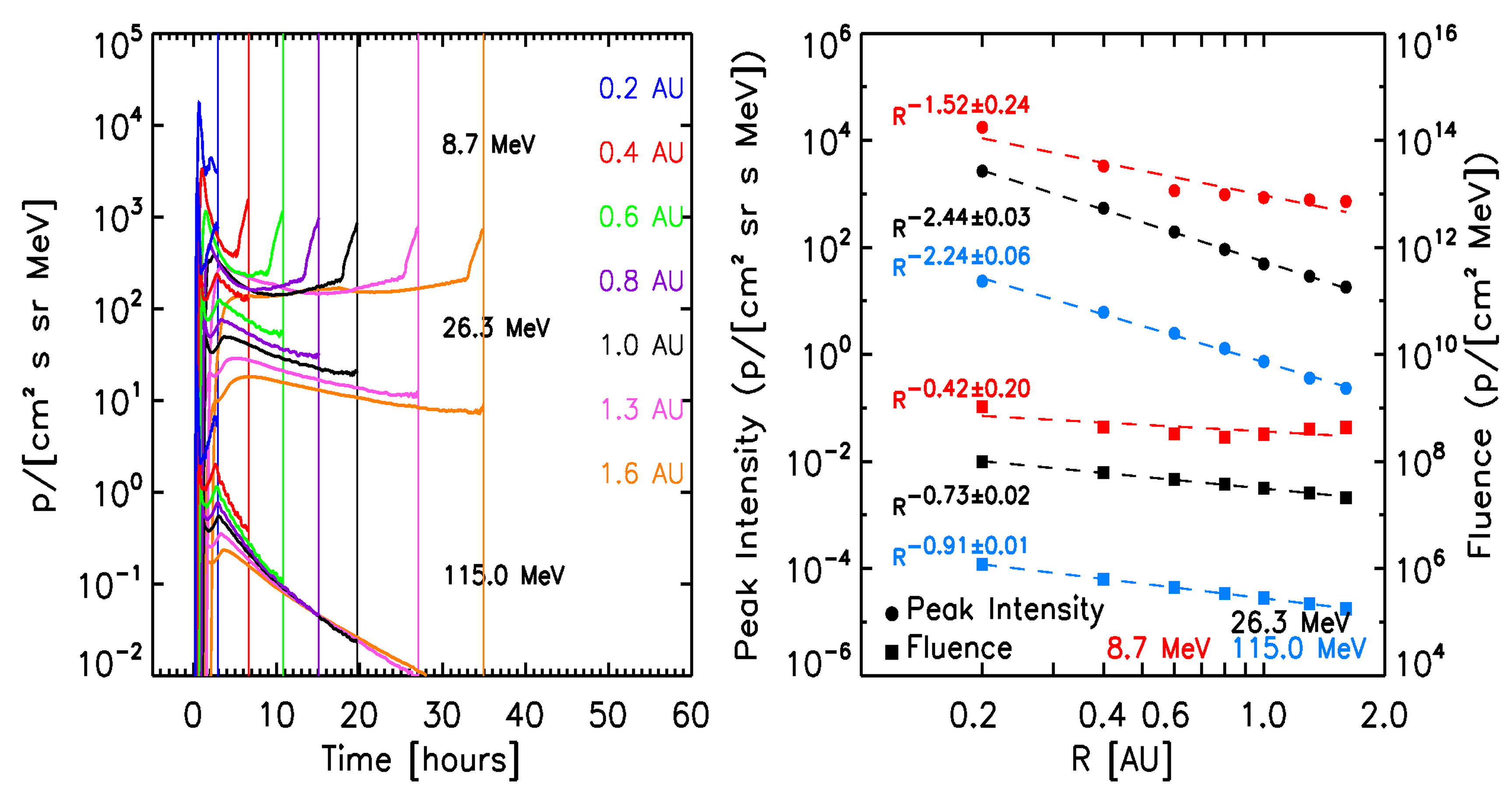 As can be seen in Figure 4 and Figure 8 (below), the derived peak flux and fluence dependences with radial distance are different event to event and depending on the proton energy considered. The radial power-law indices derived differ from the inverse quadratic/cubic law frequently assumed and close to those derived observationally for similar scenarios [20].
