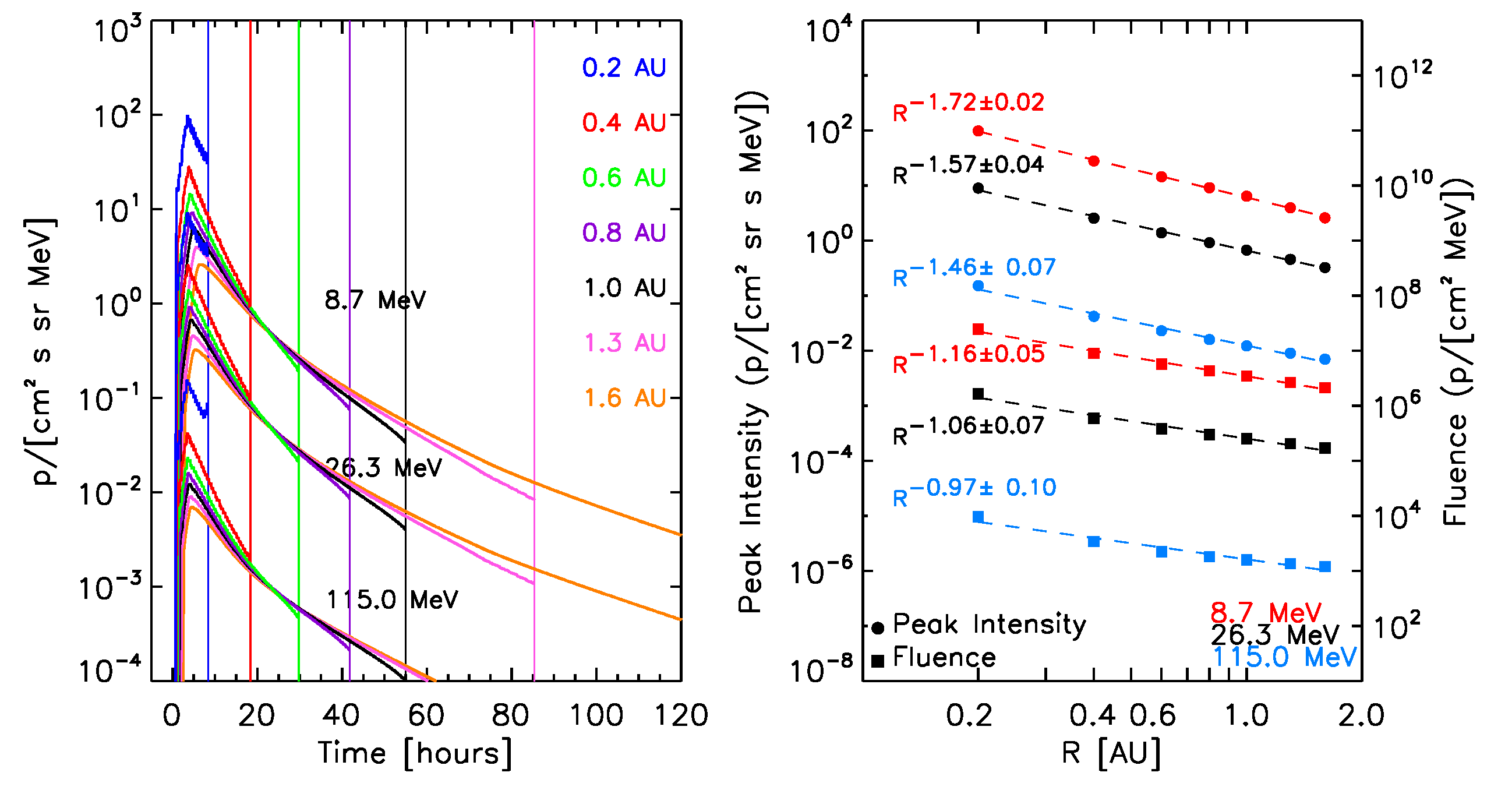 The left panels of Figure 8 show the synthetic intensity-time profiles seen by the virtual observers, for selected proton energies (indicated in each panel) for the ten reference events. The right panels of Figure 8 show the corresponding radial variations for the peak intensity (circles) and fluences (squares). A power law fit of these quantities with the radial distance (dashed lines) and the derived radial index are indicated. Note that the radial variations found for peak intensity and fluence are independent of the scaling factors but a direct result of the physical model.