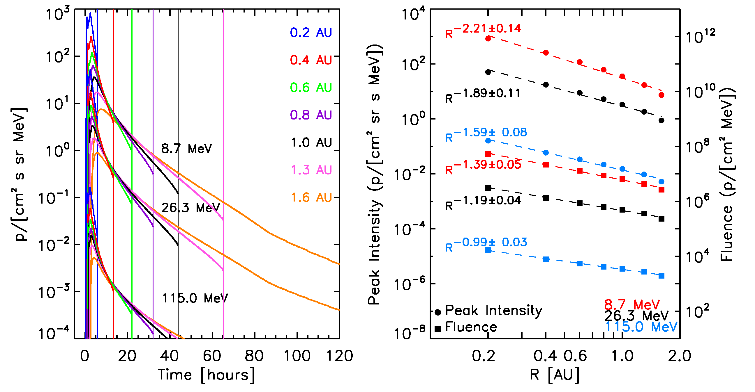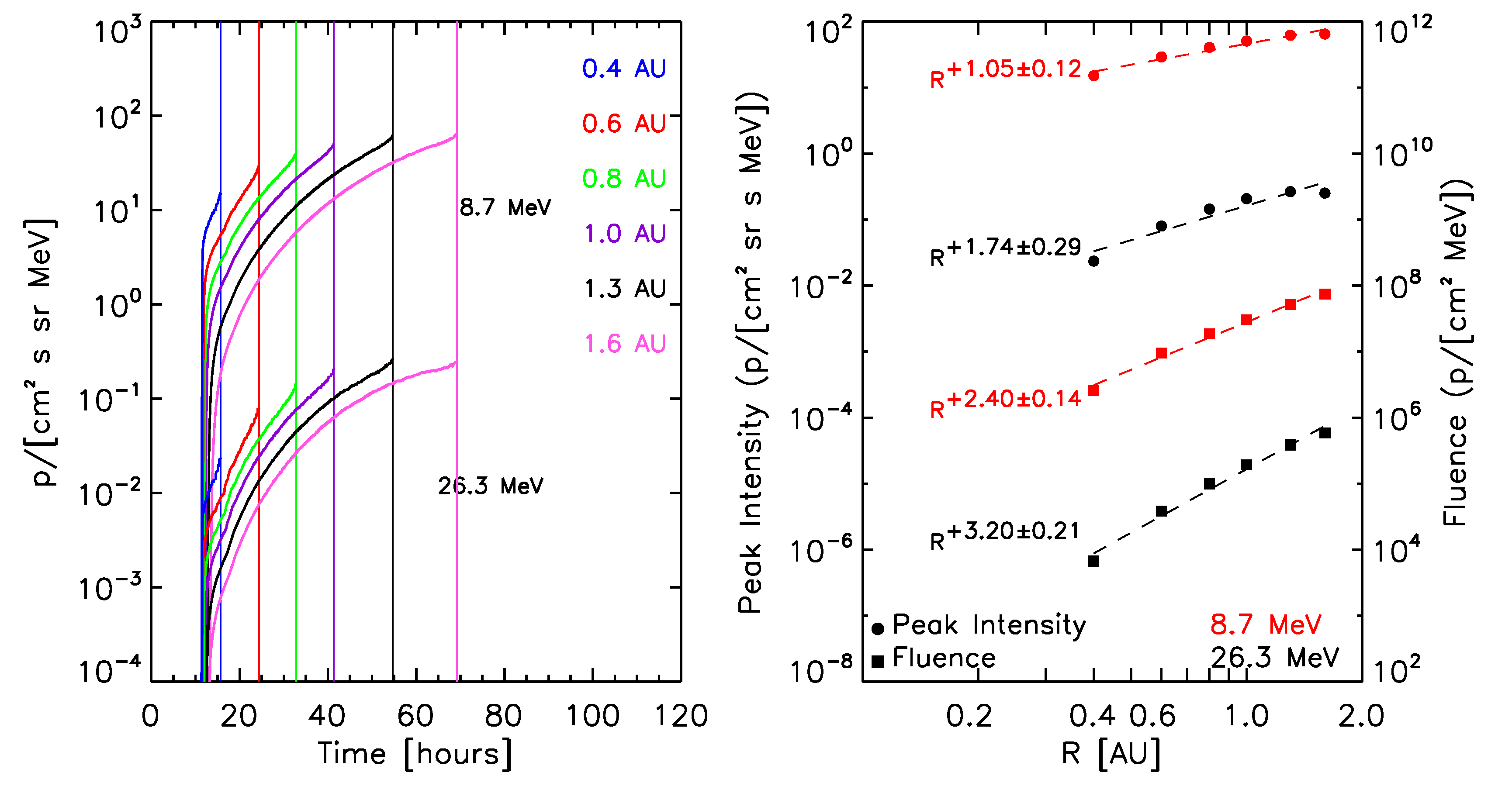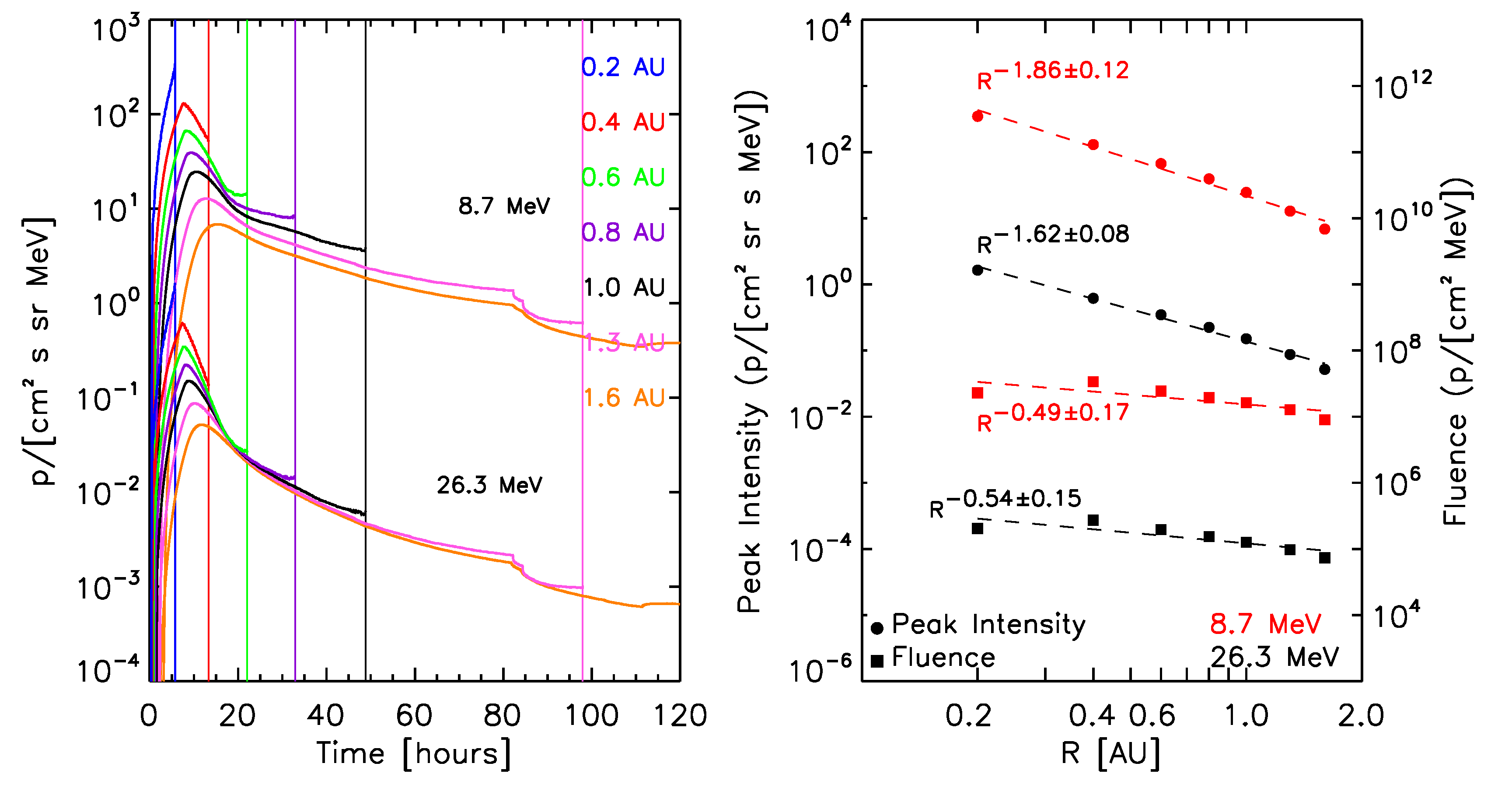 Figure 4. Example of the radial dependences for the peak flux and fluence derived for a specific solar-interplanetary scenario, for two energies.