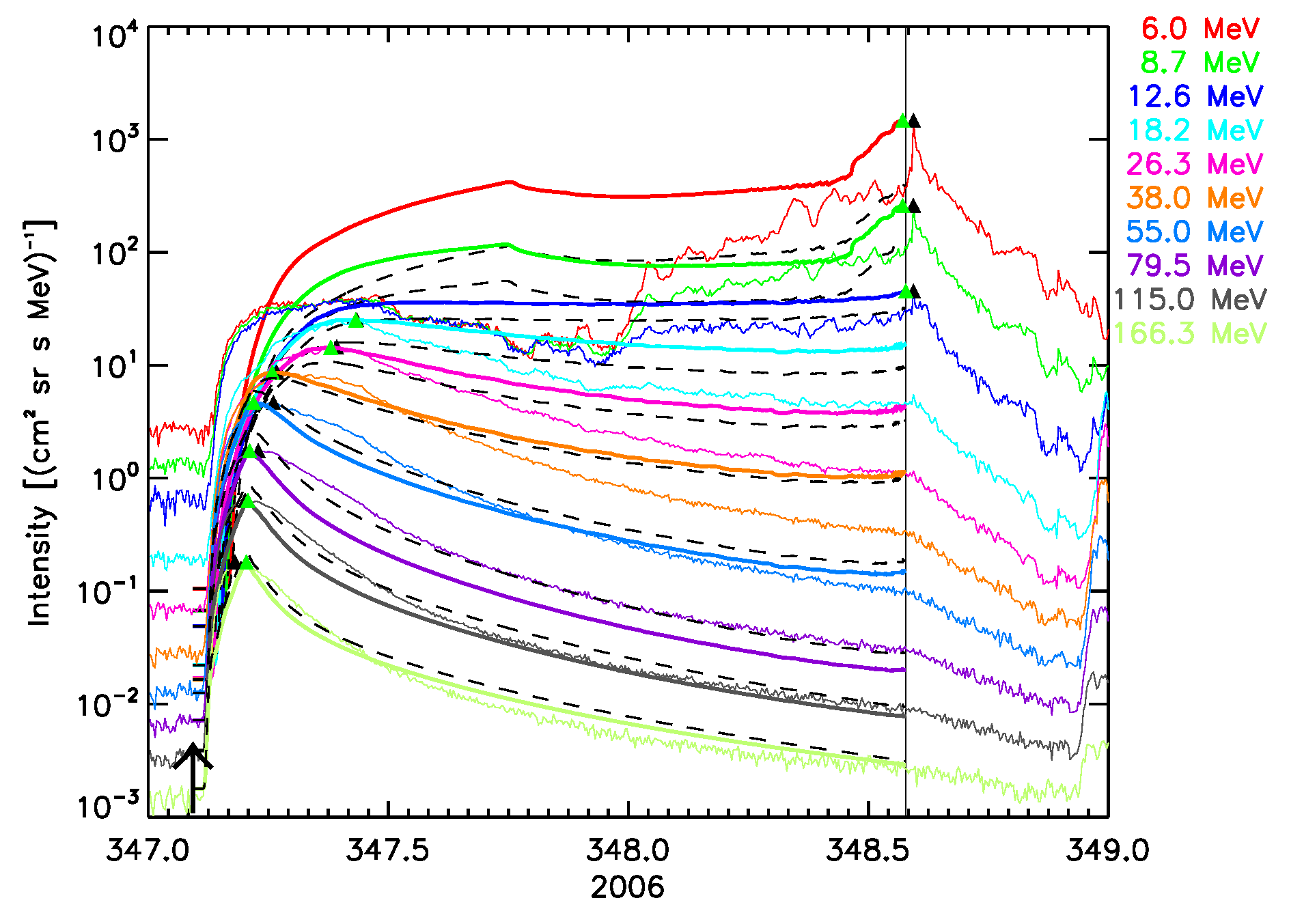 Figure 5. The six SEPEM reference cases, comparison with 1 AU Reference data. SOLPENCO2 synthetic flux profiles scaled per channel using: peak intensity (solid lines); upstream fluence (dashed lines). Observed and synthetic intensities are displayed for the mean energy, indicated at the right hand side of each panel (in MeV), of the SEPEM Reference Data energy channels. Peak intensities: observed (black triangles), simulated (green triangles). Vertical lines mark the passage of an interplanetary shock by the ACE spacecraft at L1.