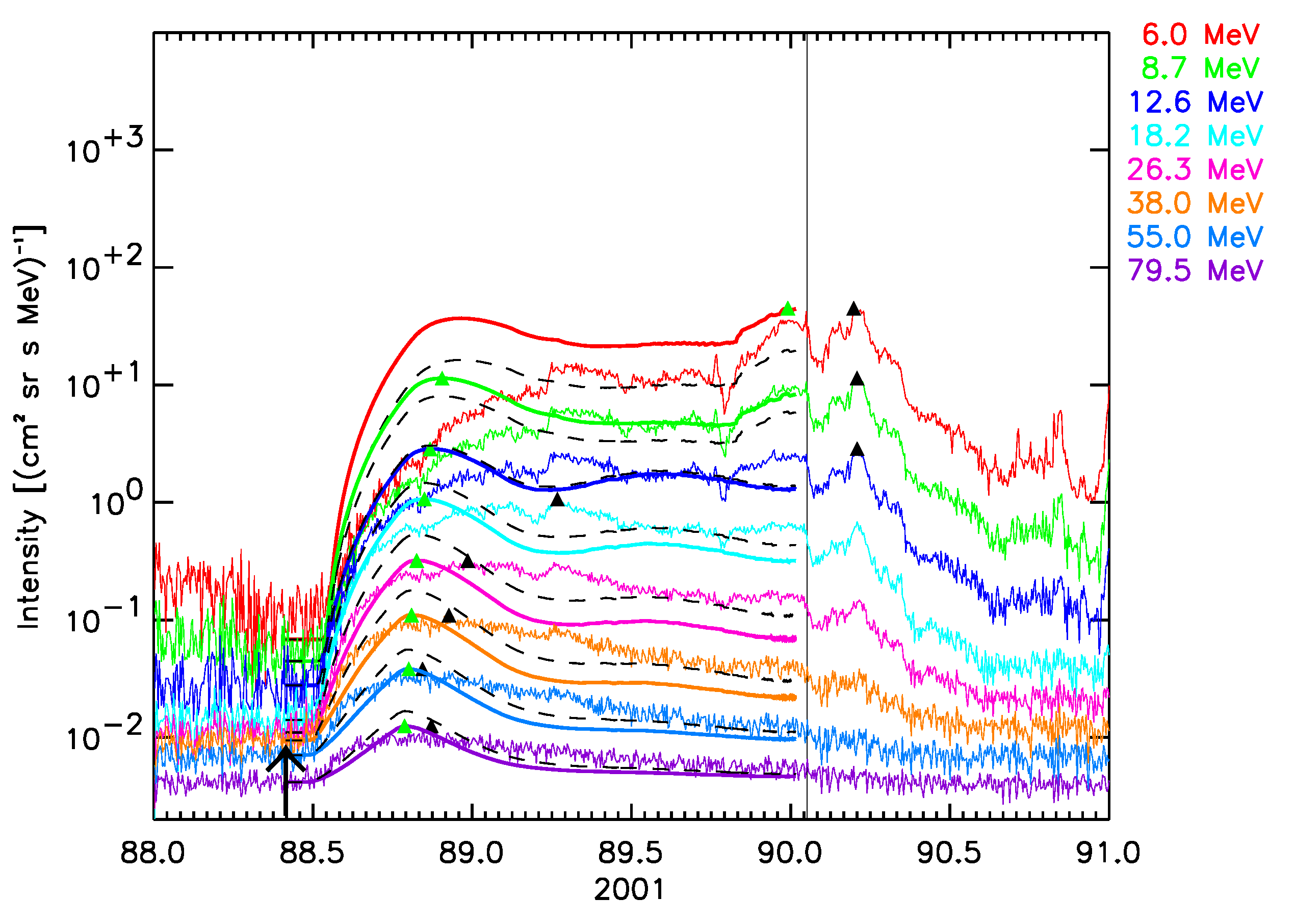 where k is a proportionality factor. This expression allows the modeller to relate the dynamic evolution of the shock strength at the cobpoint to the rate at which shock-accelerated particles are injected into the interplanetary medium. For a given SEP event, the flux and anisotropy profiles are fitted for one energy channel E0. This yields λ0 and Q0, as well as their evolution in the upstream region of the event. The dependence of Q(E) and λ(E) on the energy E is then derived by obtaining the best possible eyeball simultaneous fit to a large number of observed flux profiles (more than twenty) at selected energies, plus the simultaneous fit to the corresponding first order anisotropy profiles when available [3, 4, 8, 9, 19].