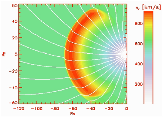 Figure 2. Snapshot of an interplanetary shock simulation propagating from Sun to ~0.5 AU. Solar wind plasma speed is colour coded (as indicated) and a set of IMF lines (white lines) is also shown.